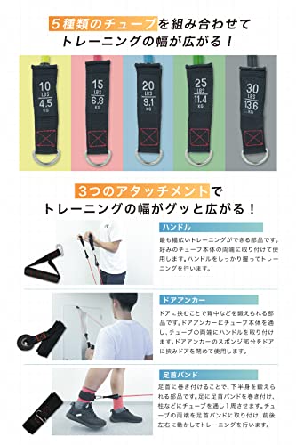 負荷の異なる5本のチューブがセットになった逸品。SNS等でもバズりまくってるので、ご存知の方も多い商品です。トレーニング解説動画も付属しているのもポイント高いですね!